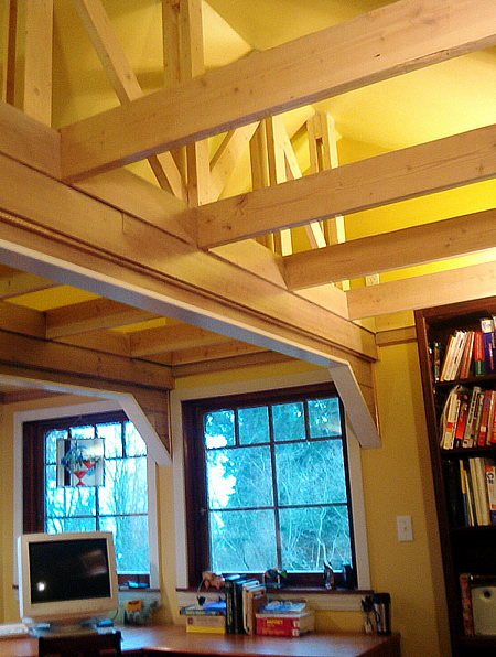 The fifth floor space, surrounded with windows and open ceiling beams is wired for DSL and is currently the owners' at-home office/studio.